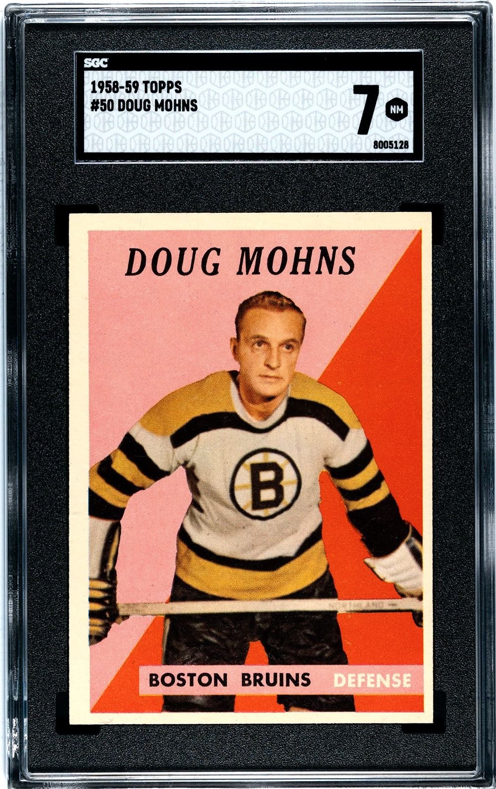 Mohns had a lengthy NHL career that spanned 22 seasons from 1953 to 1975. He played both defense and wing, and found his best success after Boston traded him to Chicago where he'd form the "Scooter Line" with Kenny Wharram and Stan Mikita. This is a pack fresh example with superior color and gloss, graded 7 NM by SGC!