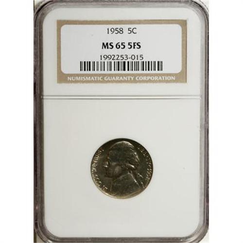 <B>1958 5C MS65 Five Full Steps NGC.</B></I> Gentle caramel-gold toning coats this satiny Gem. Tiny marks from the planchet prior to the strike are uneffaced, but the upper steps are unbroken. Census: 5 in 65 Five Full Steps, 2 finer (8/07).<BR><BR><b>Shipping:</b> Coins & Currency (<a target="_blank" href="http://www.heritageauctions.com/common/shipping.php">view shipping information</a>)