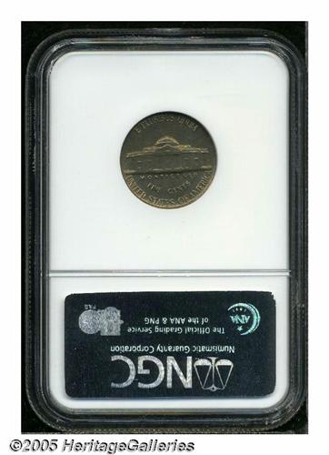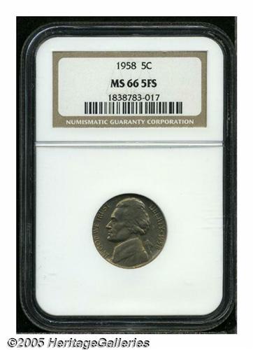 <B>1958<5C> MS66 Full Steps NGC.</B></I> Five full steps are specified on the NGC holder, and the remaining design elements are adequately defined. Deep champagne-gold patina with undertones of sky-blue bathes lustrous surfaces. A few miniscule marks are noted on Jefferson's portrait and on Monticello.