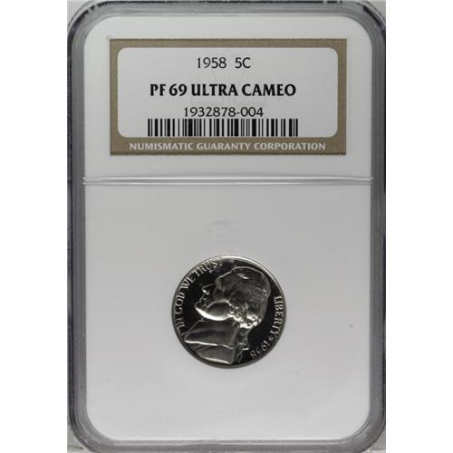 <B>1958 5C PR69 Ultra Cameo NGC.</B></I> Collectors who prize the often-elusive Ultra Cameo examples of 1950s and 1960s proof issues are sure to enjoy this remarkable black-and-white specimen. The contrast is bold, the mirrors are seemingly bottomless, and the surfaces fall just shy of perfection. NGC has certified just four Ultra Cameo examples, and of them, this is the only one in PR69 (11/06).<BR><BR><b>Shipping:</b> Coin/Currency (<a target="_blank" href="http://www.heritageauctions.com/common/shipping.php">view shipping information</a>)