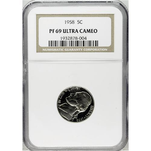 <B>1958 5C PR69 Ultra Cameo NGC.</B></I> Collectors who prize the often-elusive Ultra Cameo examples of 1950s and 1960s proof issues are sure to enjoy this remarkable black-and-white specimen. The contrast is bold, the mirrors are seemingly bottomless, and the untoned surfaces are virtually perfect. NGC and PCGS have each certified just four Ultra/Deep Cameo examples, and of them, this is the only one in PR69.<BR><BR><b>Shipping:</b> Coin/Currency (<a target="_blank" href="http://www.heritageauctions.com/common/shipping.php">view shipping information</a>)