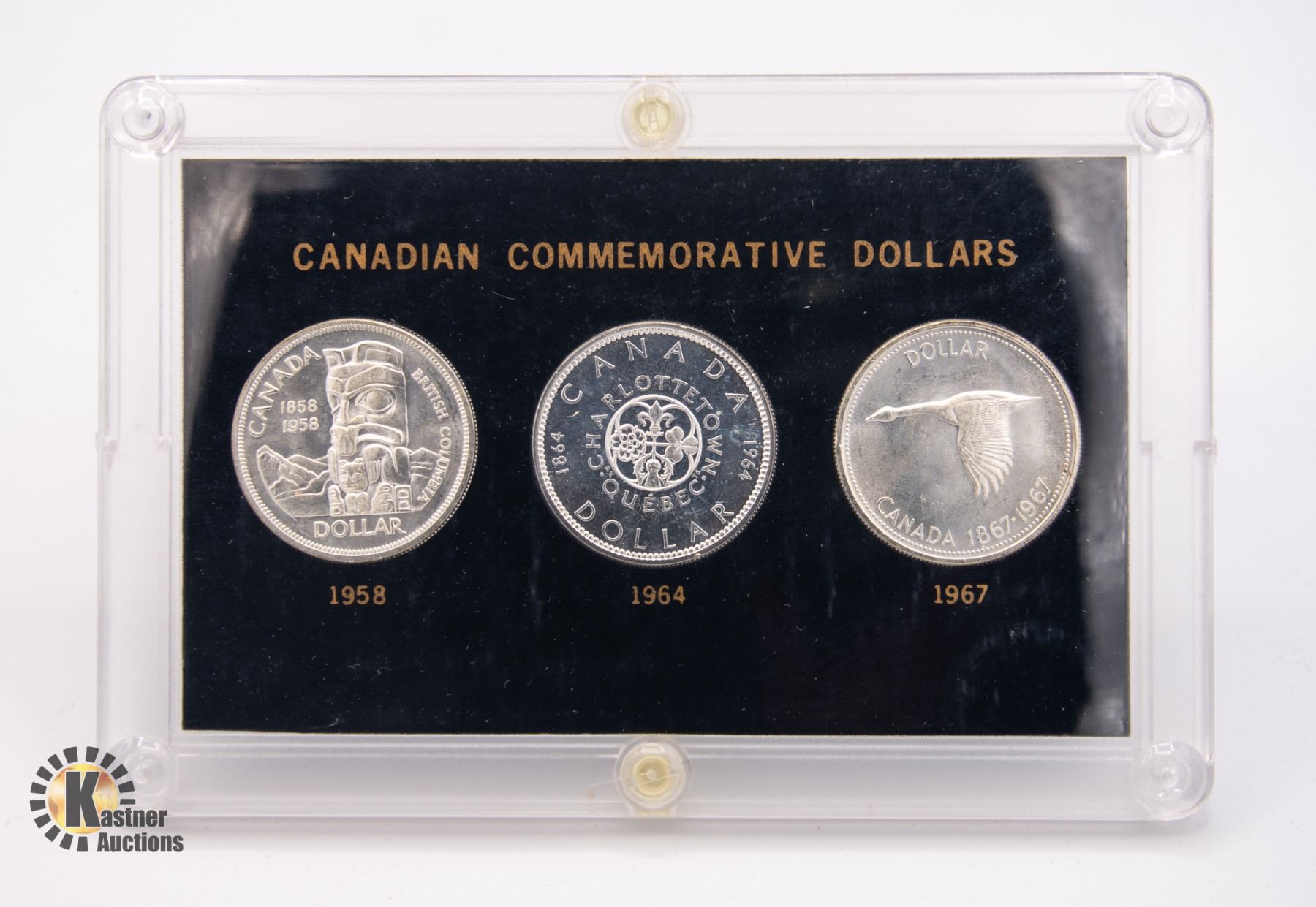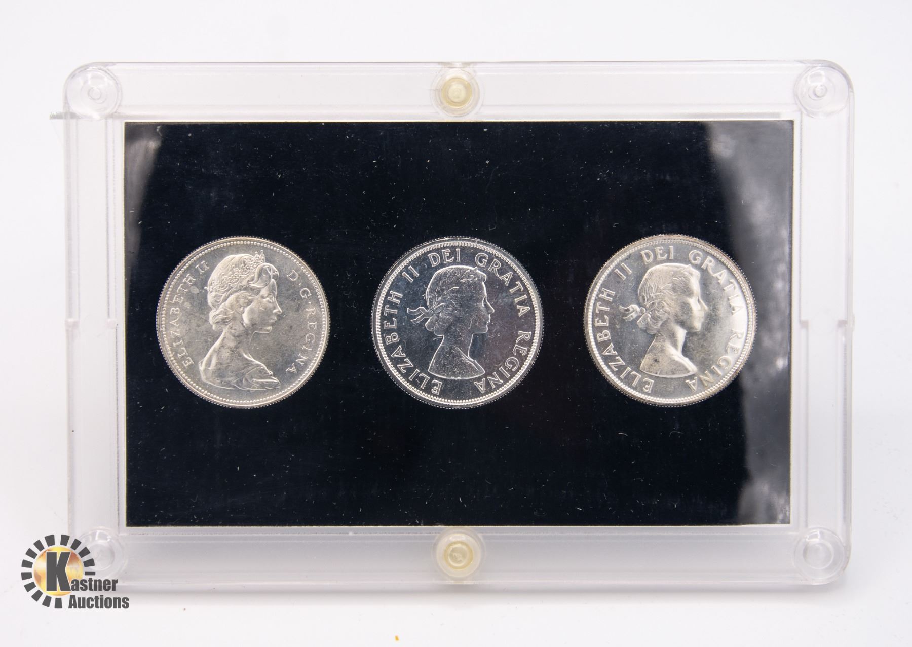 1958,64,67 SET OF 3 SILVER CANADA COMMEM. $1 COINS