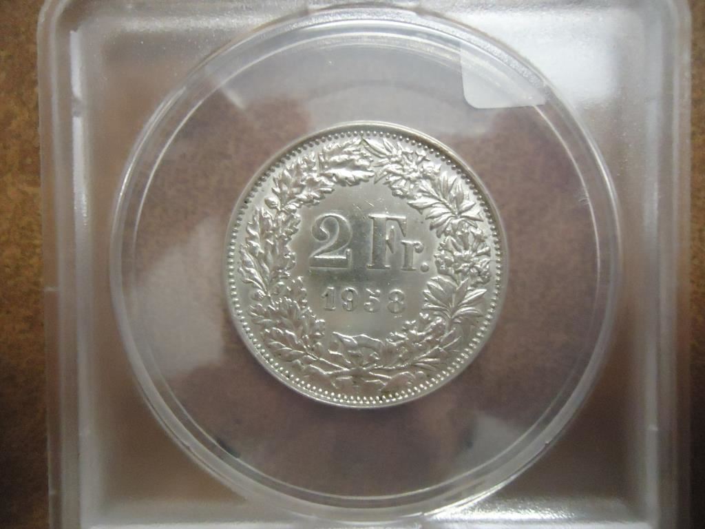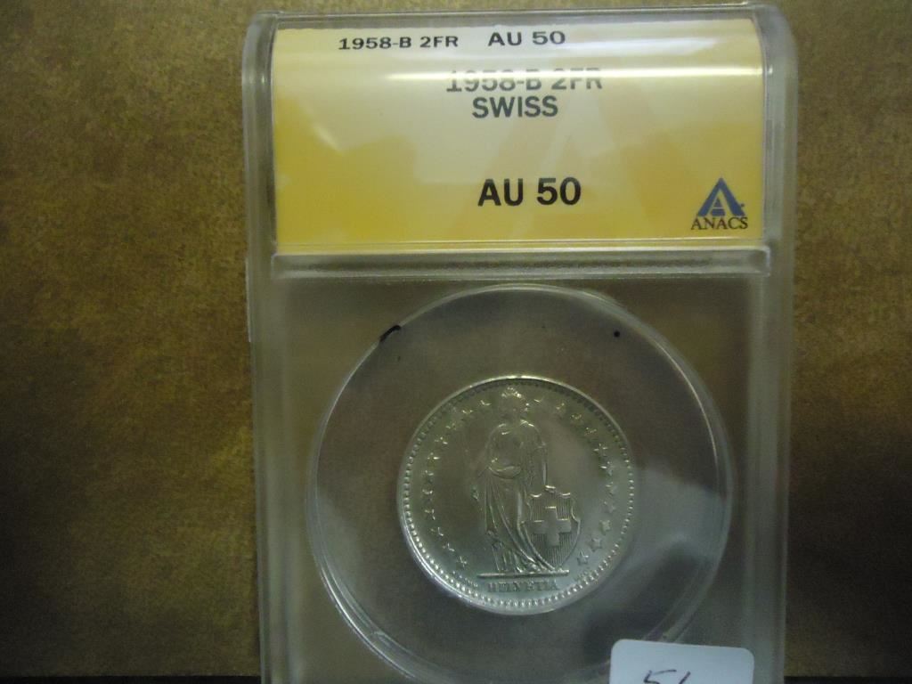 1958-B SWISS SILVER 2 FRANC ANACS AU50