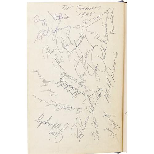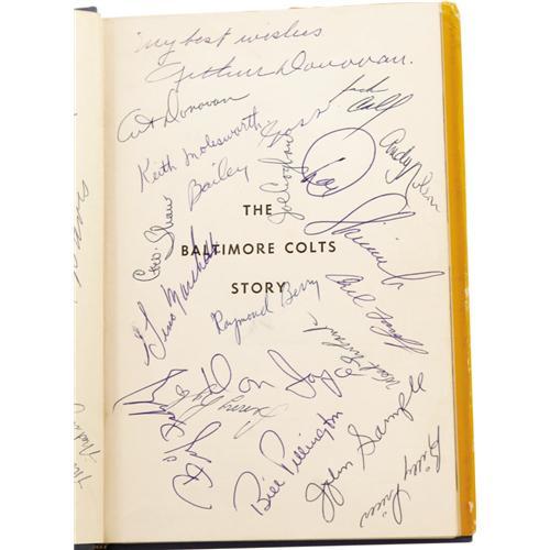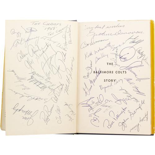<B>1958 Baltimore Colts Team Signed Book.</B></I> The victorious side in "The Greatest Game Ever Played," the 1958 NFL Championship. Thirty members of the team that conquered Frank Gifford's New York Giants at Yankee Stadium on December 28th, 1958 join forces on the title pages of <I>The Baltimore Colts Story,</B></I> each autograph remaining in the same 10/10 blue ink that appeared the year of the book's publication. Notables include Unitas, Ameche, Donovan (twice), Lipscomb, Marchetti, Berry, Parker, Sandusky and Ewbank. Team signed artifacts from this legendary squad are few and far between, and those boasting flawless signature quality are even more scarce. The book itself shows wear only to the original dust jacket, which has the former owner's name penned on the front. Certainly a rare opportunity for a serious football autograph collector. <I>LOA from PSA/DNA.</B></I>