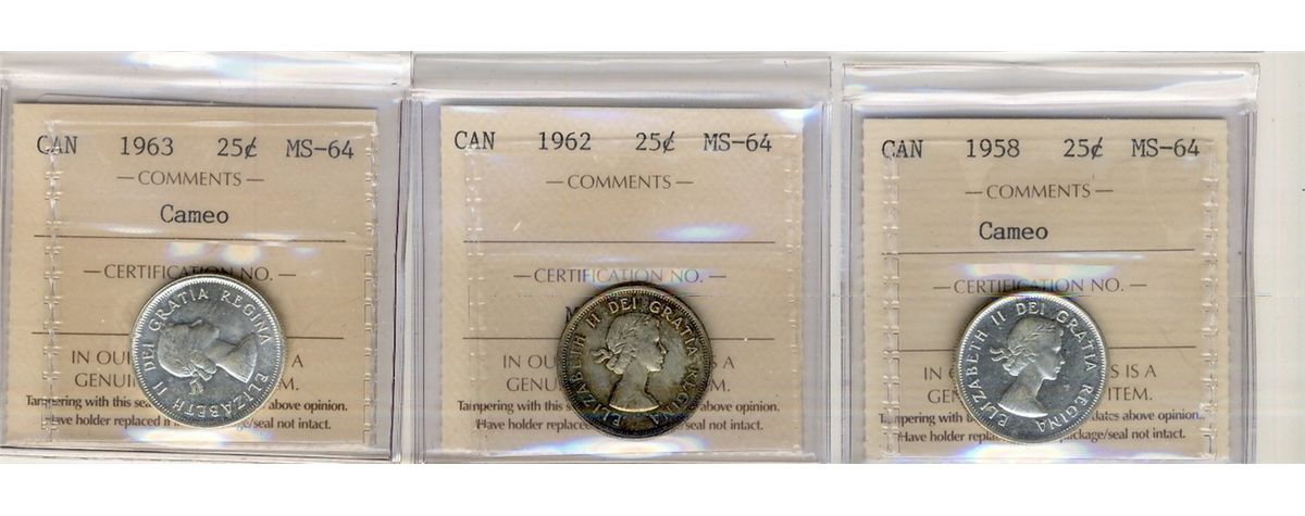 1958 Cameo, 1962 and 1963 25 Cents, ICCS MS64; Three coins.