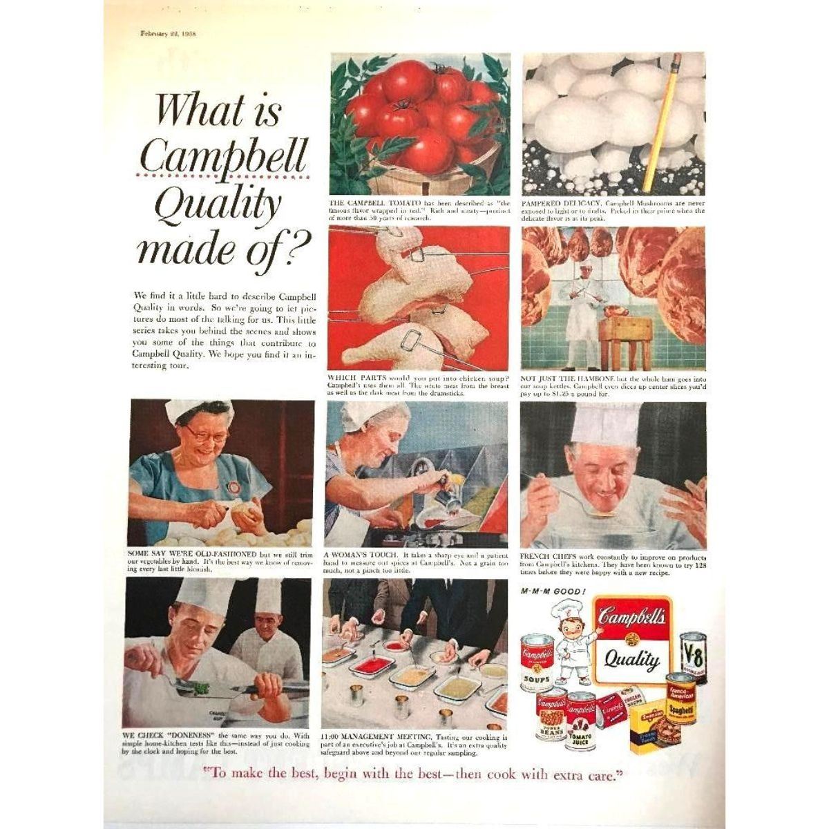 Original magazine advertisement for Campbell's Soup dated February 22, 1958. Slogan reads, "What is Campbell Quality made of?" 10 1/2' x 13 1/2" mounted on archival linen canvas for preservation.