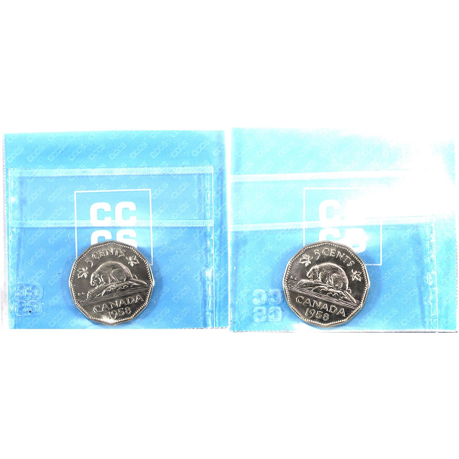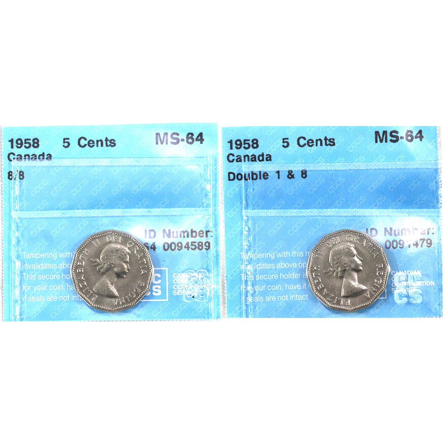 1958 Canada 5-cent 8/8 and Double 1 & 8 CCCS MS64. 2pcs