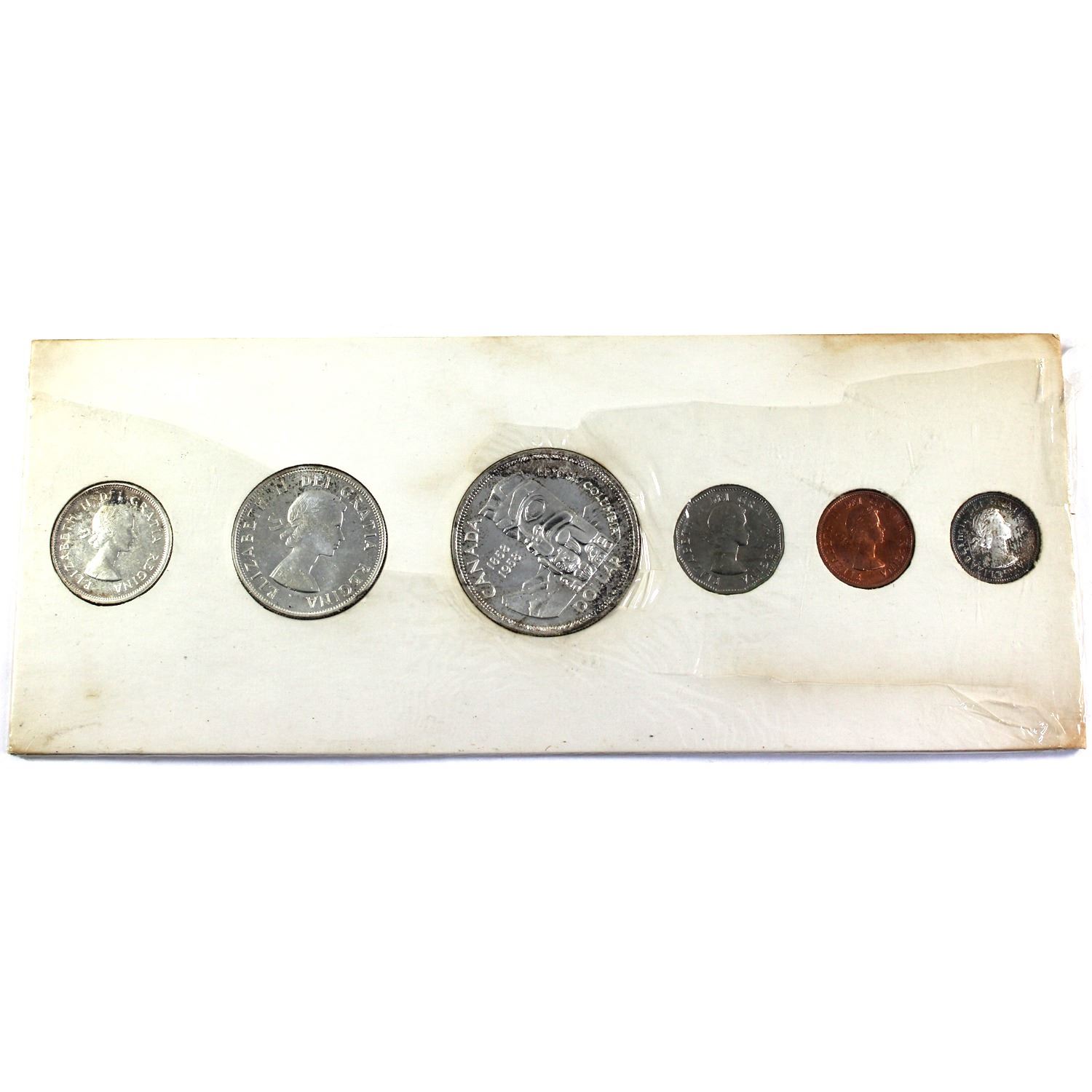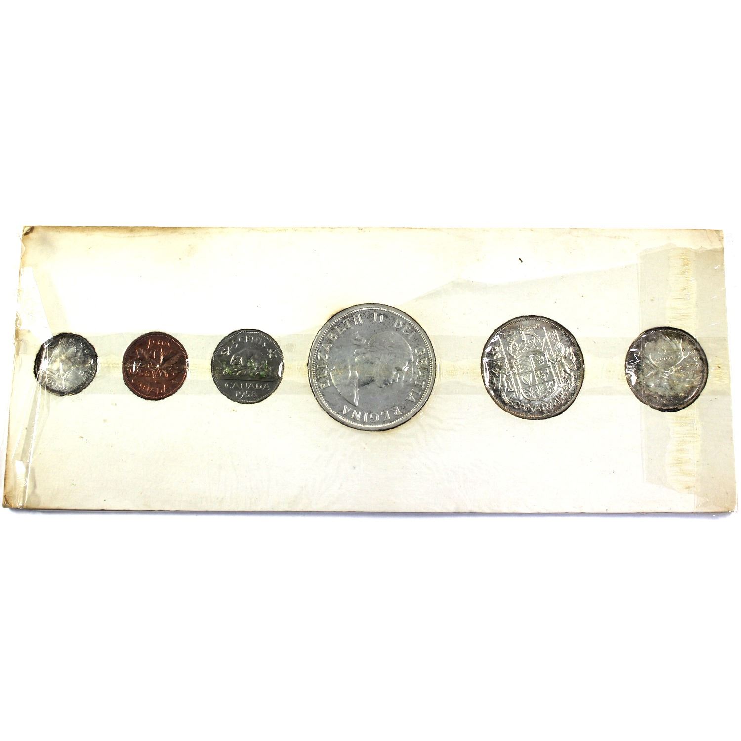 1958 Canada Proof Like Set in Original White Cardboard. Coins contain natural toning. 5-cent Corroded.