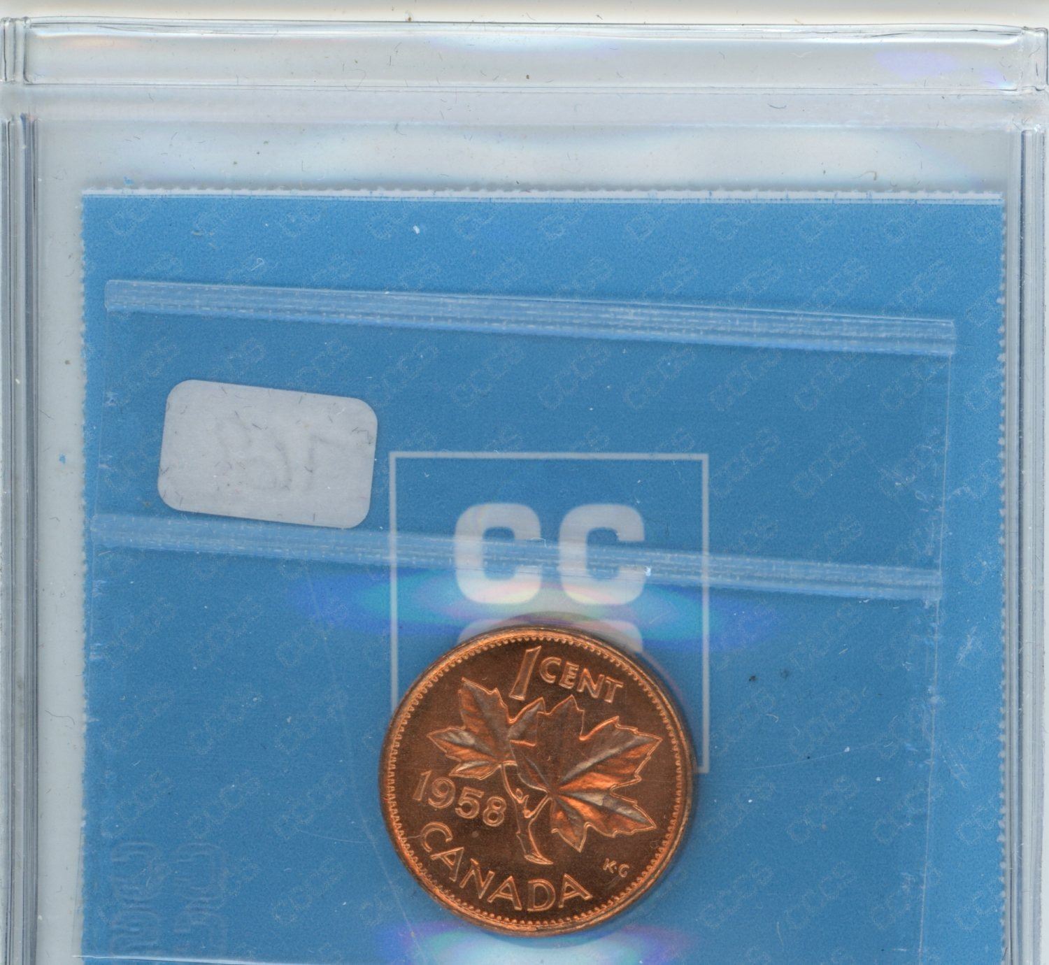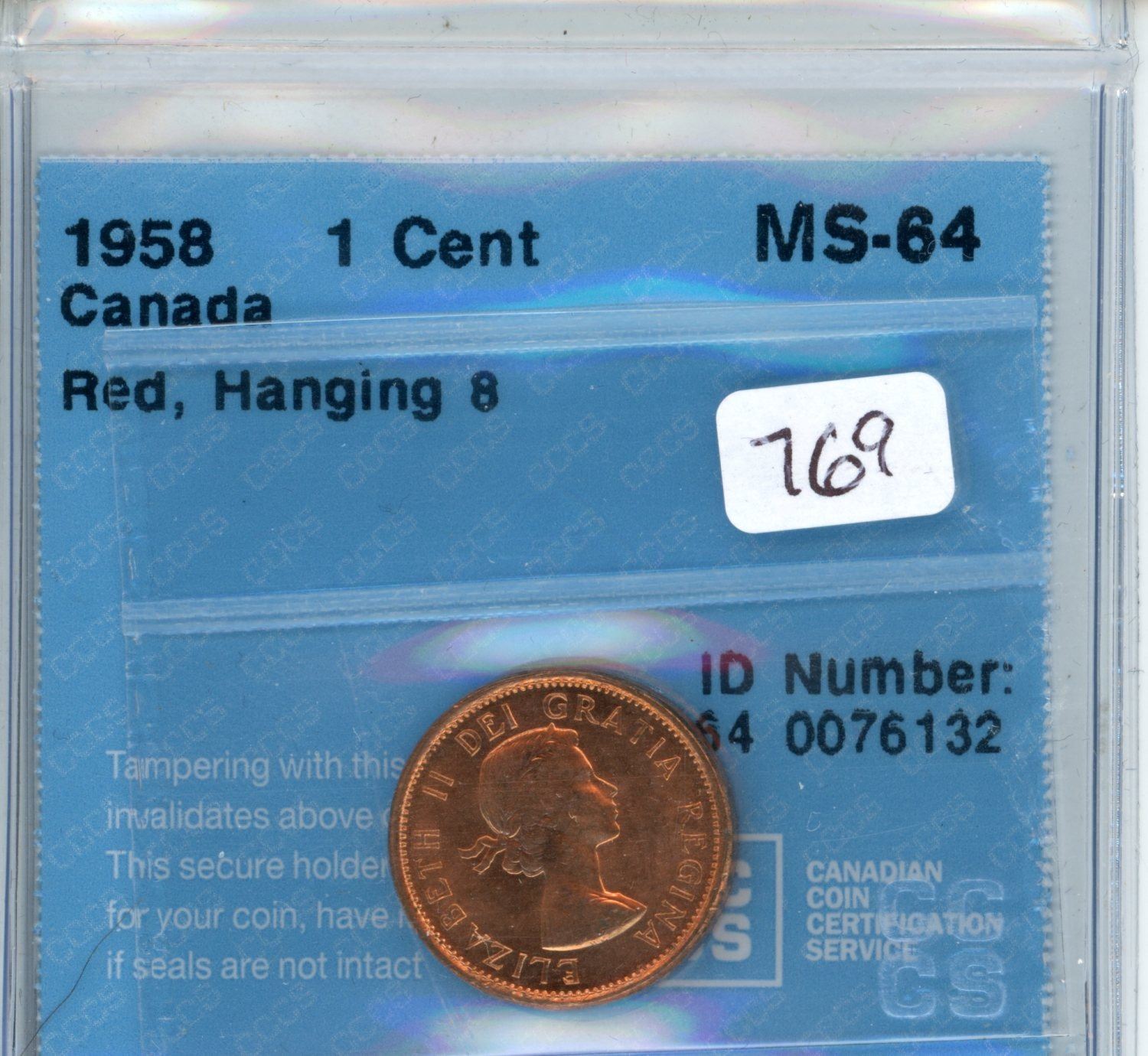 1958 Canadian 1 Cent, Red, Hanging 8 - MS-64 - CCCS Graded