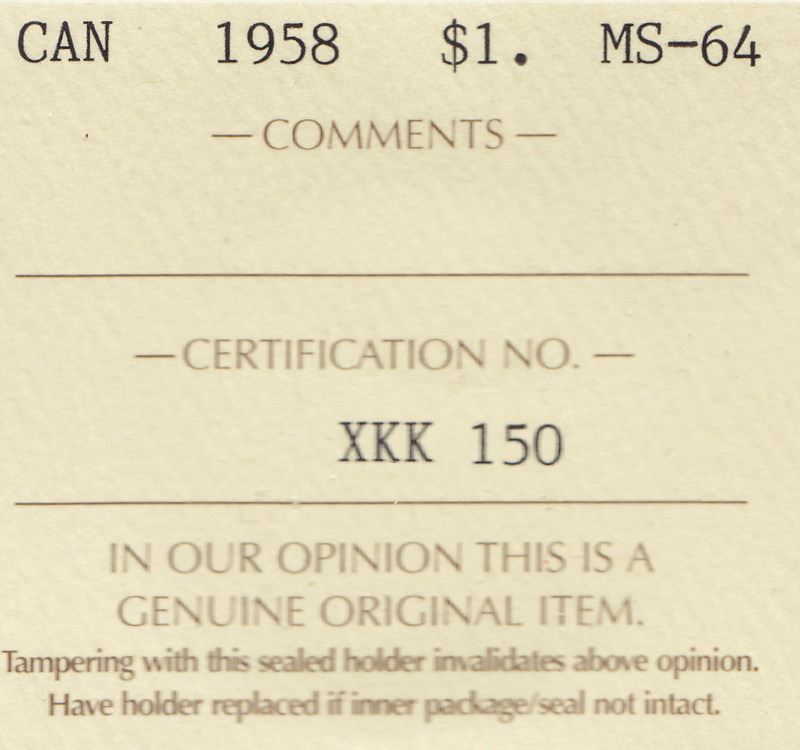 1958 Canadian Silver $1 Dollar Coin - Graded By ICCS MS-64 (XKK 150) -- This is a consignment item. If you are interested in consigning to an upcoming auction please contact us