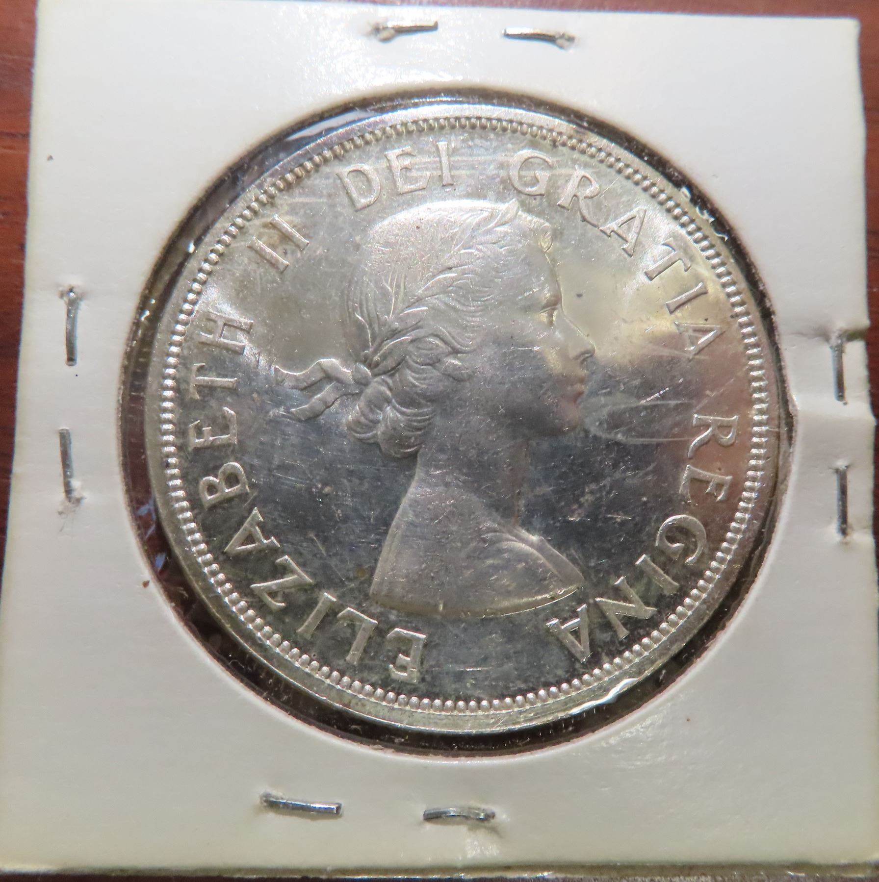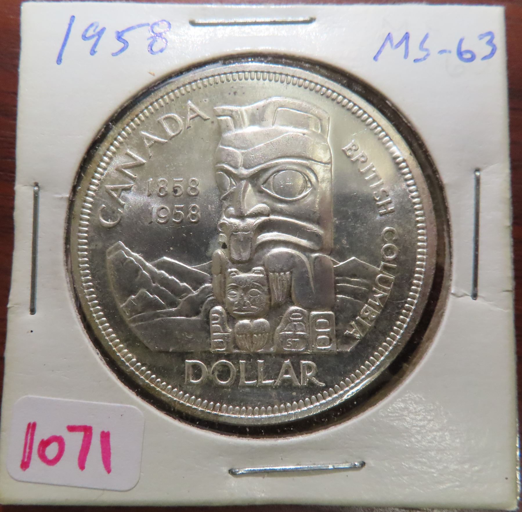 1958 Canadian Silver Dollar. Commemorates British Columbia becoming a Crown Colony in 1858. Popular Totem Pole. MS-63.