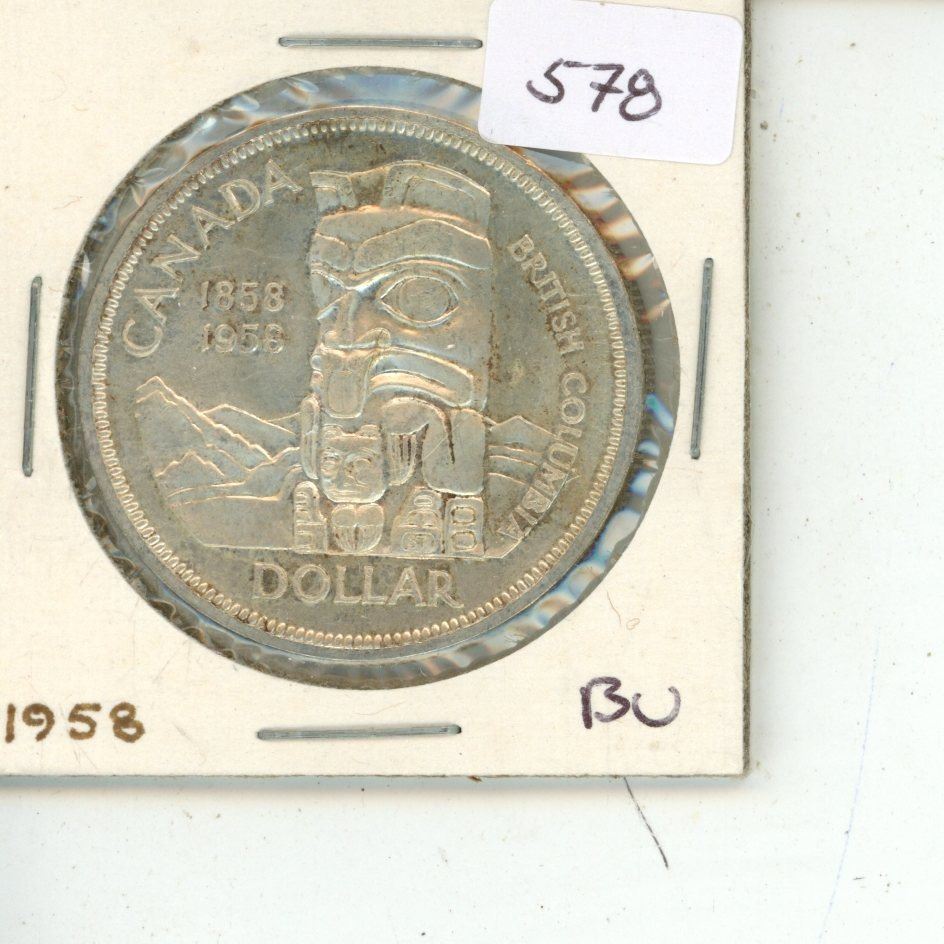 1958 Canadian Silver Dollar commemorating British Columbia becoming a Crown Colony. Totem Pole. BU