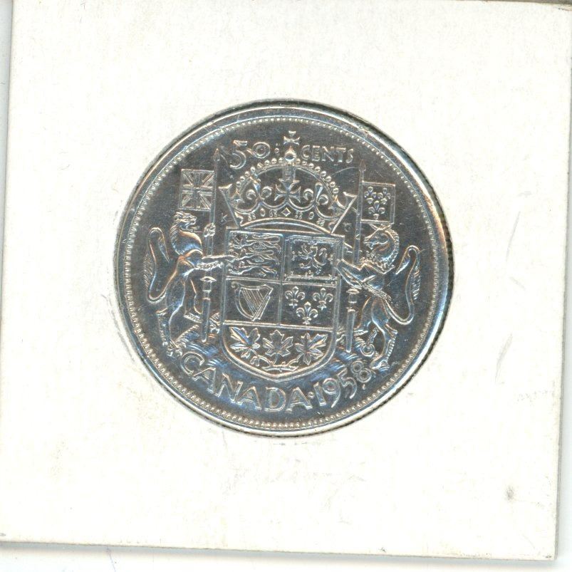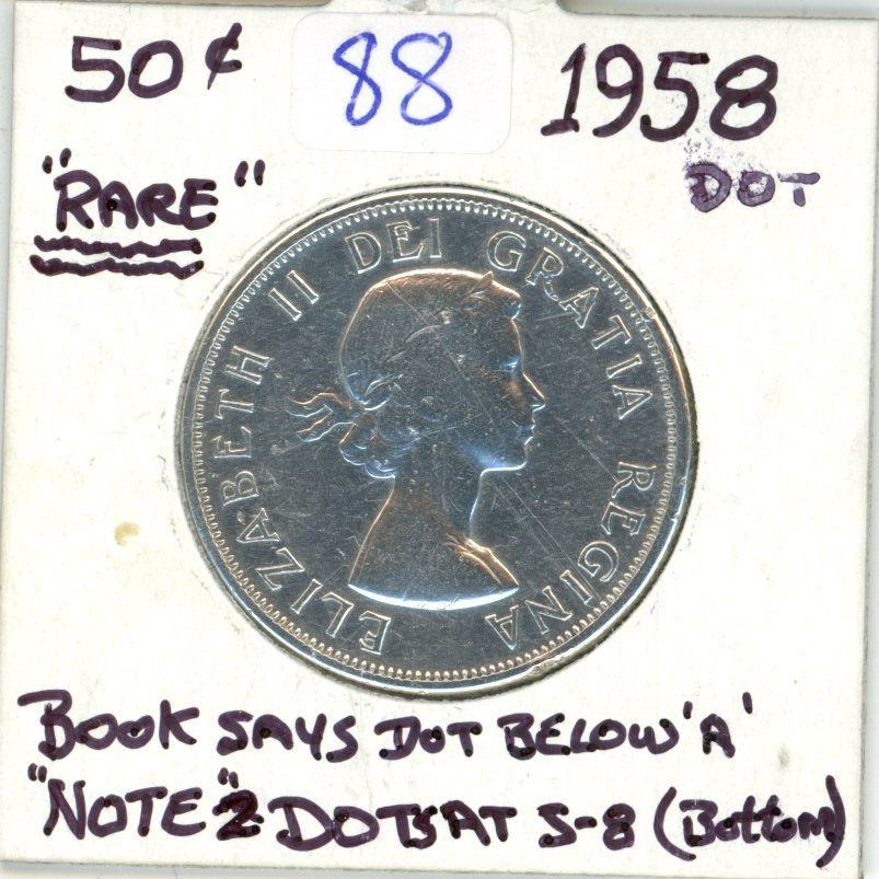 1958 Canadian silver 50 cent coin - Rare Dot