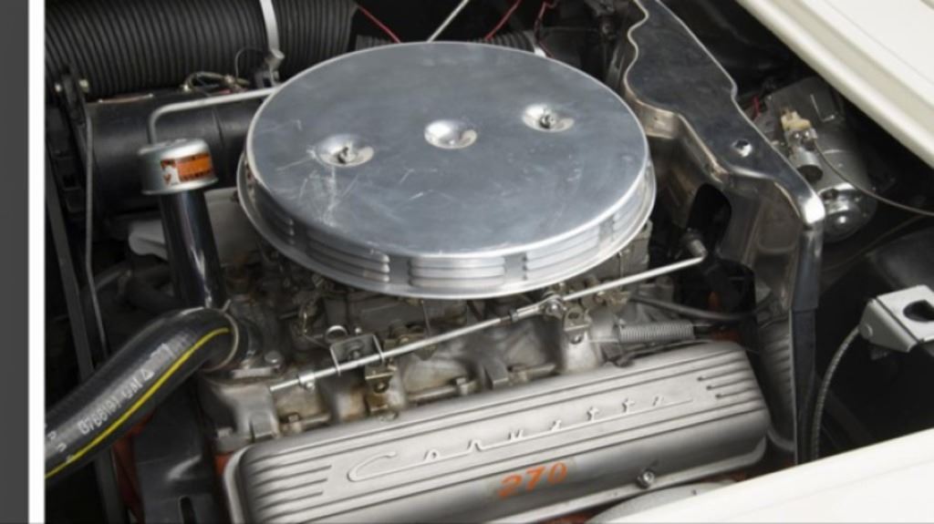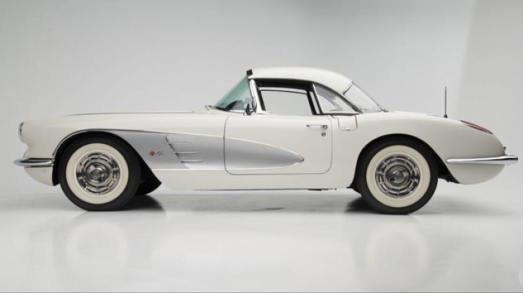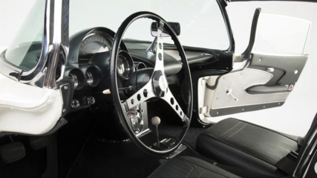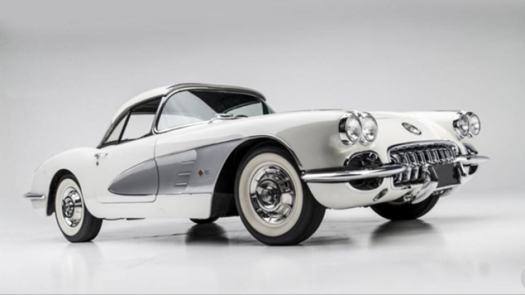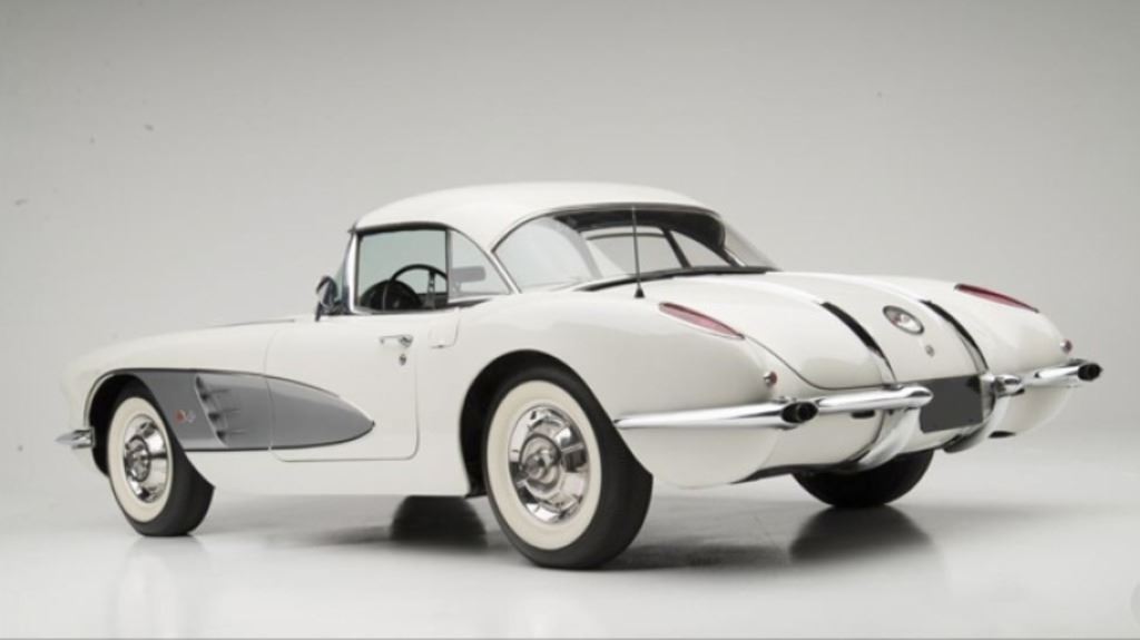 ---Saturday 4:00---. Anyone familiar with the 1960s TV series "Route 66" will recognize just how effectively Chevrolet branded the Corvette. In the mid-50s, its future was in doubt, and it took visionary Russian born designer, Zora Arkus-Duntov, to save the car from extinction. Duntov turned the early 'Vette into America's first serious production sports car, seeing the Corvette through the eyes of a European, with equal enthusiasm for design and marketing. His historic thesis, entitled "Thoughts pertaining to youth, Hot Rodders and Chevrolet," laid the foundation for Chevy's strategy to create the auto industry's first successful performance parts program. The '58 was performance parts program. The '58 was the first year General Motors actually turned a profit on the Corvette. A redesigned fiberglass body featured dual headlights, hood louvers and chrome trunk spears. This example is equipped with a 283cid V8 appointed with dual 4 barrel carburetors. The Corvette is outfitted with an optional 4-speed manual transmission, Wonder Bar push-button radio, BFGoodrich whitewall tires with an unused 6.70-15 spare still in the trunk. The fully documented restoration was completed in September '07 with only running-in miles added. Finished in Snowcrest White with Inca Silver coves and re-upholstered with correct Pebble Black interior. The car has a black convertible top and the optional hardtop