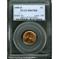 1958-D 1C MS67 Red PCGS. Fully struck save for not <B>1958-D 1C MS67 Red PCGS.</B></I> Fully struck save for not atypical weakness on PL, with rich glittering luster and absolutely beautiful red-orange and steel-green coloration. Both sides of the piece seem pristine. A really lovely Superb Gem. Population: 40 in 67, 0 finer (10/04). <BR><BR><B>Important notice:</B> Heritage usually auctions material at the rate of 200-250 lots per hour. On some occasions eBay Live bid software or the Internet may not be able to keep up with the pace of the auction. We recommend placing a realistic absentee bid now as insurance to avoid disappointment. Occasionally the auctioneer may eliminate or reject an eBay Live bid, and the auctioneer may also reopen a lot after the close of the eBay live bidding (usually because we missed an audience bid), and may reject your bid even if it shows you as the winning bidder. By bidding via eBay Live, you agree that Heritage may award the lot to another bidder at its sole discretion under the circumstances described above or any other reasonable circumstances. Since eBay bids are not shown to us until we open the lot on the floor, we treat those bids just like floor bids. In most cases the floor responds before the eBay bid is presented to us, due to Internet lag time, so for consistency we have made it a policy that floor bids are always considered first over tie eBay live bids. Also please note that all Heritage lots purchased through eBay Live carry a 20% Buyer's Premium. Please make sure you read the Terms and Conditions before you bid. This lot is being auctioned in conjunction with a live floor auction by Heritage Galleries & Auctioneers. All final auction and invoice information will be supplied by Heritage Galleries & Auctioneers, and all other information should be considered preliminary. Lot:5396