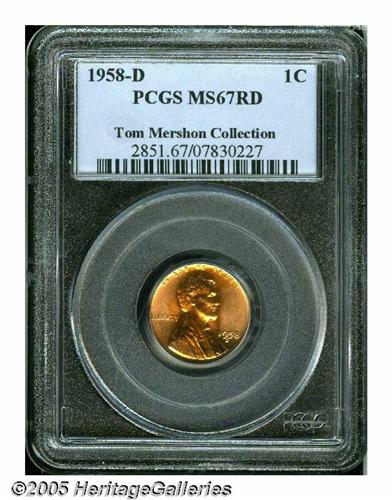 <B>1958-D<1C> MS67 Red PCGS.</B></I> Scintillating luster and bright golden-orange surfaces of almost impeccable quality. Present population: 48 in 67, 0 finer (3/05).<BR><I>From The Tom Mershon #2 All-Time PCGS Registry Set of Lincoln Wheat Cents.</B></I>