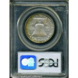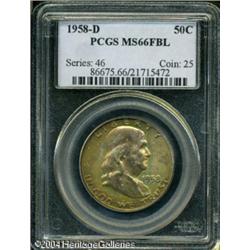 1958-D 50C MS66 Full Bell Lines PCGS. A medium int <B>1958-D 50C MS66 Full Bell Lines PCGS.</B></I> A medium intensity melange of gold, crimson, lavender, and sea-green toning embellishes the obverse, as well as the left border of the reverse. Well struck design elements, with lustrous surfaces that reveal just a few miniscule marks on Franklin's cheek and on the Liberty Bell. <BR><BR><B>Important notice:</B> Heritage usually auctions material at the rate of 200-250 lots per hour. On some occasions eBay Live bid software or the Internet may not be able to keep up with the pace of the auction. We recommend placing a realistic absentee bid now as insurance to avoid disappointment. Occasionally the auctioneer may eliminate or reject an eBay Live bid, and the auctioneer may also reopen a lot after the close of the eBay live bidding (usually because we missed an audience bid), and may reject your bid even if it shows you as the winning bidder. By bidding via eBay Live, you agree that Heritage may award the lot to another bidder at its sole discretion under the circumstances described above or any other reasonable circumstances. Since eBay bids are not shown to us until we open the lot on the floor, we treat those bids just like floor bids. In most cases the floor responds before the eBay bid is presented to us, due to Internet lag time, so for consistency we have made it a policy that floor bids are always considered first over tie eBay live bids. Also please note that all Heritage lots purchased through eBay Live carry a 20% Buyer's Premium. Please make sure you read the Terms and Conditions before you bid. This lot is being auctioned in conjunction with a live floor auction by Heritage Galleries & Auctioneers. All final auction and invoice information will be supplied by Heritage Galleries & Auctioneers, and all other information should be considered preliminary. Lot:6326