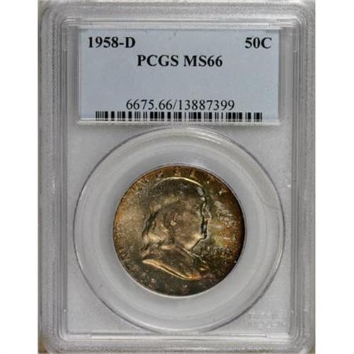 <B>1958-D 50C MS66 PCGS.</B></I> PCGS Population (270/9). NGC Census: (297/22). Mintage: 23,962,412. Numismedia Wsl. Price for NGC/PCGS coin in MS66: $58. (#6675)<BR><BR><B>Coin Engraver:</B> John R. Sinnock<BR><BR><b>Shipping:</b> Coins & Currency (<a target="_blank" href="http://www.heritageauctions.com/common/shipping.php">view shipping information</a>\)