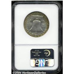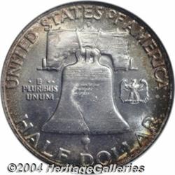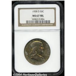<B>1958-D<50C> MS67 Full Bell Lines NGC.</B></I> Intense gold and crimson patina on the obverse is accented by small splashes of aqua, while the reverse has light silver-gold color in the central area framed by crimson, orange, and aqua around the border. Sharply struck, with no mentionable abrasions. <BR><BR><B>Important notice:</B> Heritage usually auctions material at the rate of 200-250 lots per hour. On some occasions eBay Live bid software or the Internet may not be able to keep up with the pace of the auction. We recommend placing a realistic absentee bid now as insurance to avoid disappointment. Occasionally the auctioneer may eliminate or reject an eBay Live bid, and the auctioneer may also reopen a lot after the close of the eBay live bidding (usually because we missed an audience bid), and may reject your bid even if it shows you as the winning bidder. By bidding via eBay Live, you agree that Heritage may award the lot to another bidder at its sole discretion under the circumstances described above or any other reasonable circumstances. Since eBay bids are not shown to us until we open the lot on the floor, we treat those bids just like floor bids. In most cases the floor responds before the eBay bid is presented to us, due to Internet lag time, so for consistency we have made it a policy that floor bids are always considered first over tie eBay live bids. Also please note that all Heritage lots purchased through eBay Live carry a 20% Buyer's Premium. Please make sure you read the Terms and Conditions before you bid. </span></font></tr></table></td></tr></table>