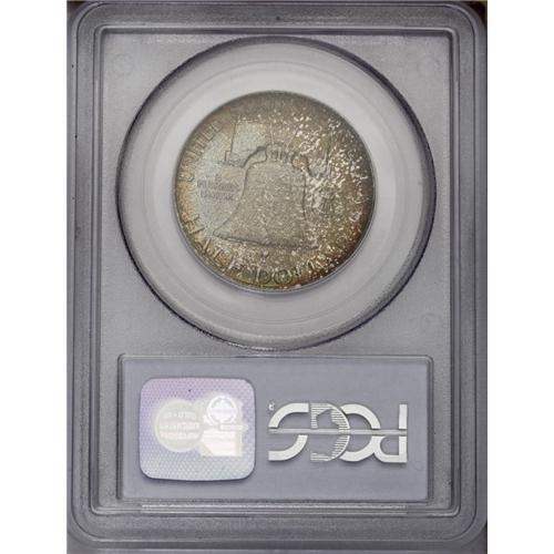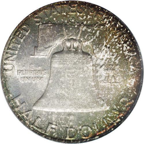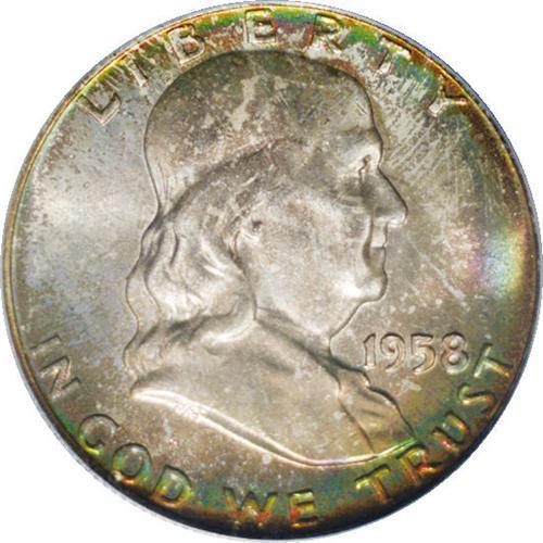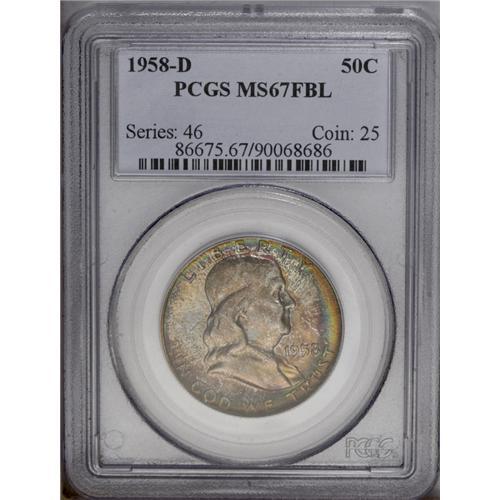 <B>1958-D<50C> MS67 Full Bell Lines PCGS.</B></I> Exceptional rainbow toning around the obverse periphery which couples lemon-yellow with verdant green hues, less intense but matching on the reverse. Toned with speckled gold over luster for the balance of the coin. Scattered abrasions are few and far between, and the strike is full and complete. Currently at the top of the grading charts for this date and mint. Population: 24 in 67, 0 finer (1/06).