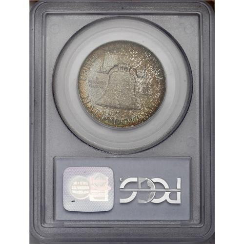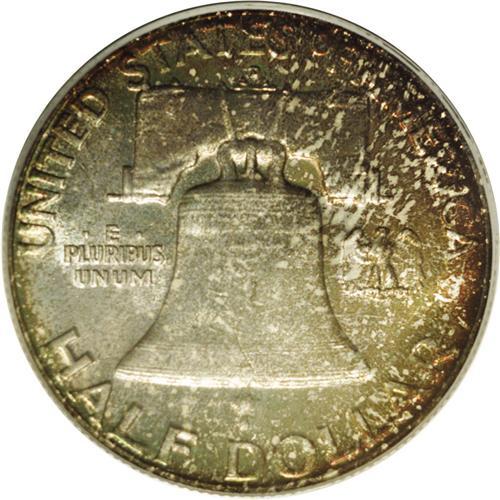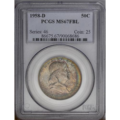 <B>1958-D<50C> MS67 Full Bell Lines PCGS.</B></I> Exceptional rainbow toning around the obverse periphery which couples lemon-yellow with verdant green hues, less intense but matching on the reverse. Toned with speckled gold over luster for the balance of the coin. Scattered abrasions are few and far between, and the strike is exacting. Population: 24 in 67, 0 finer (3/06). <BR><BR><B>Important notice:</B> Heritage usually auctions material at the rate of 200-250 lots per hour. On some occasions eBay Live bid software or the Internet may not be able to keep up with the pace of the auction. We recommend placing a realistic absentee bid now as insurance to avoid disappointment. Occasionally the auctioneer may eliminate or reject an eBay Live bid, and the auctioneer may also reopen a lot after the close of the eBay live bidding (usually because we missed an audience bid), and may reject your bid even if it shows you as the winning bidder. By bidding via eBay Live, you agree that Heritage may award the lot to another bidder at its sole discretion under the circumstances described above or any other reasonable circumstances. Since eBay bids are not shown to us until we open the lot on the floor, we treat those bids just like floor bids. In most cases the floor responds before the eBay bid is presented to us, due to Internet lag time, so for consistency we have made it a policy that floor bids are always considered first over tie eBay live bids. Also please note that all Heritage lots purchased through eBay Live carry a 20% Buyer's Premium. Please make sure you read the Terms and Conditions before you bid. This lot is being auctioned in conjunction with a live floor auction by Heritage Galleries & Auctioneers. All final auction and invoice information will be supplied by Heritage Galleries & Auctioneers, and all other information should be considered preliminary. Lot:3122 <BR><BR><B>Winning Notification and Billing:</B> After the FINAL session in this auction is complete, Heritage will send e-mail and snail mail invoices. This process normally takes several days. All final auction and invoice information will be supplied by Heritage Galleries & Auctioneers, and all other information should be considered preliminary. <BR><BR>This auction will be conducted on a live auction floor and over the Internet through eBay Live. If you choose to place an absentee bid, please take a moment to <font color='#0000ff'><u><a href='http://pages.ebay.com/liveauctions/help/before/laabsentee.html'>learn how eBay Live absentee bidding works</a></u></font><font color='#000000'>