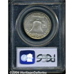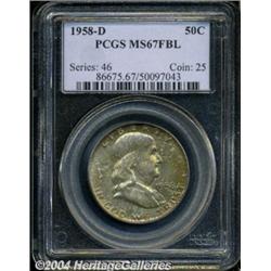 <B>1958-D<50C> MS67 Full Bell Lines PCGS.</B></I> Varying shades of green, yellow, orange, and violet toning dominate the obverse; the reverse consists of dappled olive and gold toning, accented by light green coloration along portions of the border. Sharply struck and showing no obvious abrasions. <BR><BR><B>Important notice:</B> Heritage usually auctions material at the rate of 200-250 lots per hour. On some occasions eBay Live bid software or the Internet may not be able to keep up with the pace of the auction. We recommend placing a realistic absentee bid now as insurance to avoid disappointment. Occasionally the auctioneer may eliminate or reject an eBay Live bid, and the auctioneer may also reopen a lot after the close of the eBay live bidding (usually because we missed an audience bid), and may reject your bid even if it shows you as the winning bidder. By bidding via eBay Live, you agree that Heritage may award the lot to another bidder at its sole discretion under the circumstances described above or any other reasonable circumstances. Since eBay bids are not shown to us until we open the lot on the floor, we treat those bids just like floor bids. In most cases the floor responds before the eBay bid is presented to us, due to Internet lag time, so for consistency we have made it a policy that floor bids are always considered first over tie eBay live bids. Also please note that all Heritage lots purchased through eBay Live carry a 20% Buyer's Premium. Please make sure you read the Terms and Conditions before you bid. </span></font></tr></table></td></tr></table>