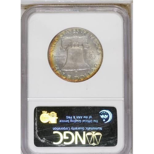 <B>1958-D 50C MS67 NGC.</B></I> Crisply struck with lovely, original toning on both sides that ranges from deep charcoal-gray in the centers to iridescent sky-blue, crimson, and orange-gold in the fields and near the periphery. Wonderfully preserved. Census: 22 in 67, 0 finer (12/06).<BR><BR><b>Shipping:</b> Coin/Currency (<a target="_blank" href="http://www.heritageauctions.com/common/shipping.php">view shipping information</a>)