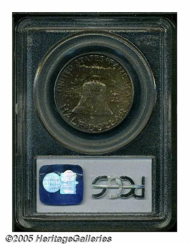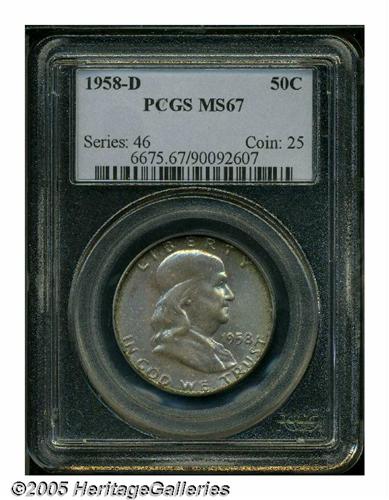<B>1958-D<50C> MS67 PCGS.</B></I> Wonderful surfaces greet you on the obverse with a complete azure blue undertoning. The reverse is a kaleidoscope of reds and greens that will delight any aficionado of toned coins. The design features are sharply struck, and there are no significant marks to report. Population: 5 in 67, 0 finer (3/05).