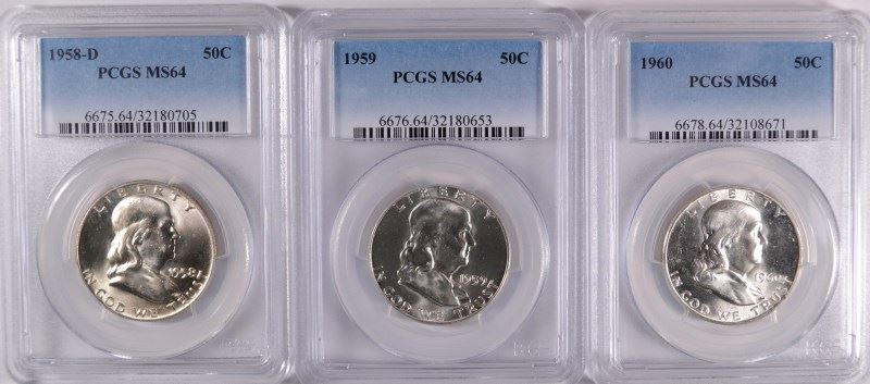 1958-D, 59 & 60 FRANKLIN HALF DOLLARS, PCGS MS-64