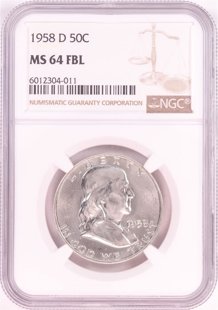 One 1958-D Franklin Half Dollar Coin NGC MS64FBL. NGC Certified.