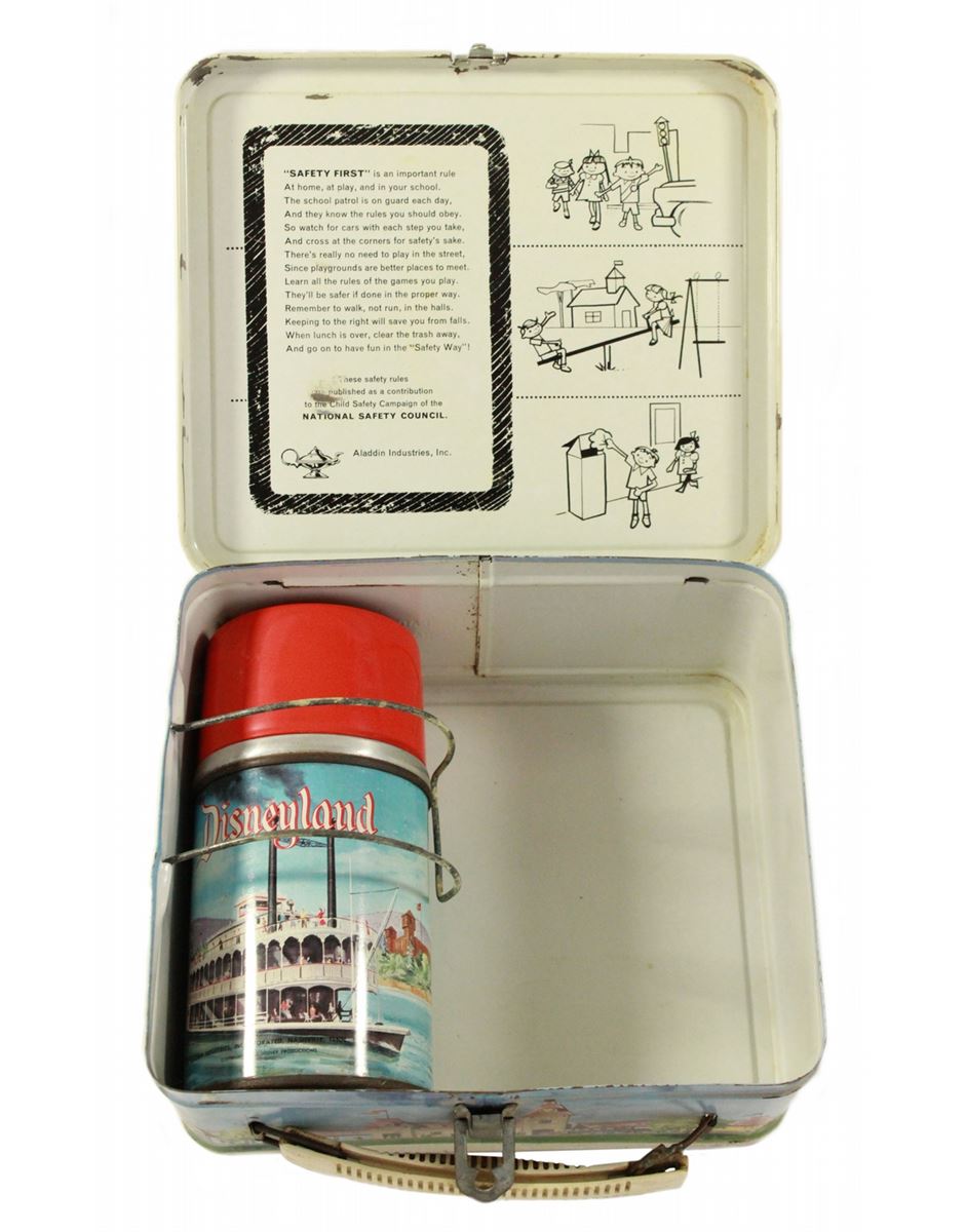 A fantastic early-park item. This metal lunch box comes with its thermos and still closes and latches. The colors and imagery have held up well over time but the box and thermos do have some moderate wear, particularly to the edges. Measures 6.75"x8".
