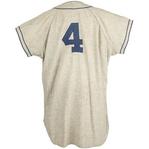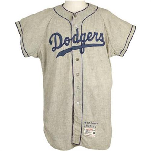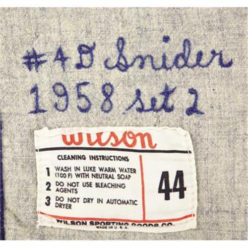 <B>1958 Duke Snider Game Worn Jersey.</B></I> "We wept," the Hall of Fame Dodgers outfielder said of his teammates' reaction to their departure from Ebbets. "Brooklyn was a lovely place to hit. If you got a ball in the air, you had a chance to get it out. When they tore down Ebbets Field, they tore down a little piece of me." Even today, a full half century since the hated Walter O'Malley pulled up stakes and headed west, you'll find the borough of Brooklyn full of senior citizens who have yet to get over the betrayal. But, in many ways, those tears shed back in 1957 were the nourishment needed for the game to grow, and for the fulfillment of baseball's Manifest Destiny. Today we couldn't imagine the Major Leagues confined to one side of the Mississippi River.<BR><BR>Dating to what may well be, in retrospect, the most important season in our National Pastime's history, this road grey Los Angeles Dodgers jersey might even have seen action during the first Major League game on the West Coast. The Dodgers would celebrate Opening Day, 1958 as the visitors to the newly christened San Francisco Giants at Seals Stadium. Though the club wouldn't see anything close to the same level of success in 1958 that the following World Championship season would bring, this first-year style is clearly the most desirable of all Los Angeles models. The supple grey flannel body provides the classic "Dodgers" on the chest, the only year the road model would not announce "Los Angeles" instead. Snider's retired number "4" appears on verso. While most jerseys from this era were sent down to the minors following the season and reworked with the new team's design, this example remains 100% original and unaltered but for two of the seven buttons on the jersey front. The tail holds the proper "Wilson [size] 44" label beneath a blue chainstitched "#4 D Snider, 1958 Set 2." Wear is solid and consistent throughout, following in the theme of supreme desirability. The jersey was sourced through a gentleman close to the Dodgers organization, who also provides the Roy Campanella game worn pants offered within this auction. <I>LOA from Lou Lampson.</B></I><BR><BR><b>Shipping:</b> Clothing, Costumes & Jerseys (<a target="_blank" href="http://www.heritageauctions.com/common/shipping.php">view shipping information</a>)