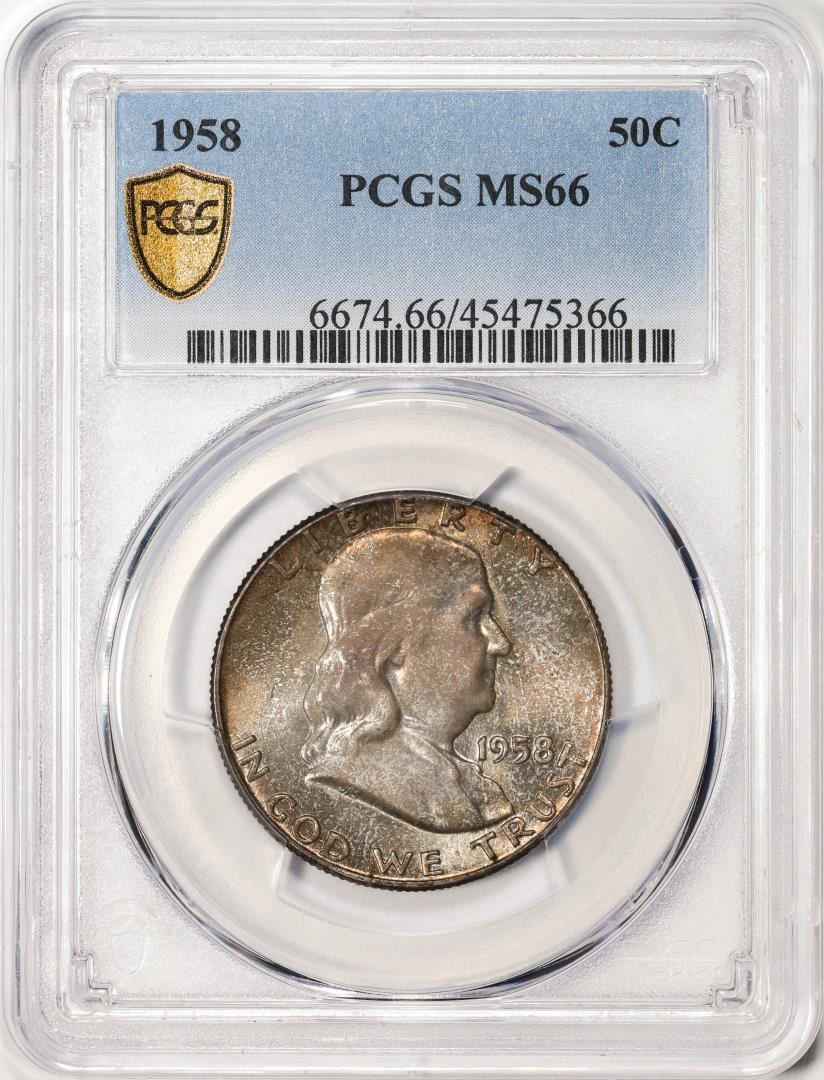 One 1958 Franklin Half Dollar Coin PCGS MS66 Nice Toning. PCGS Graded.