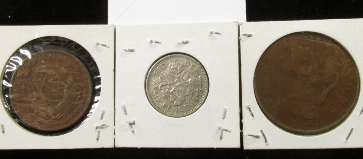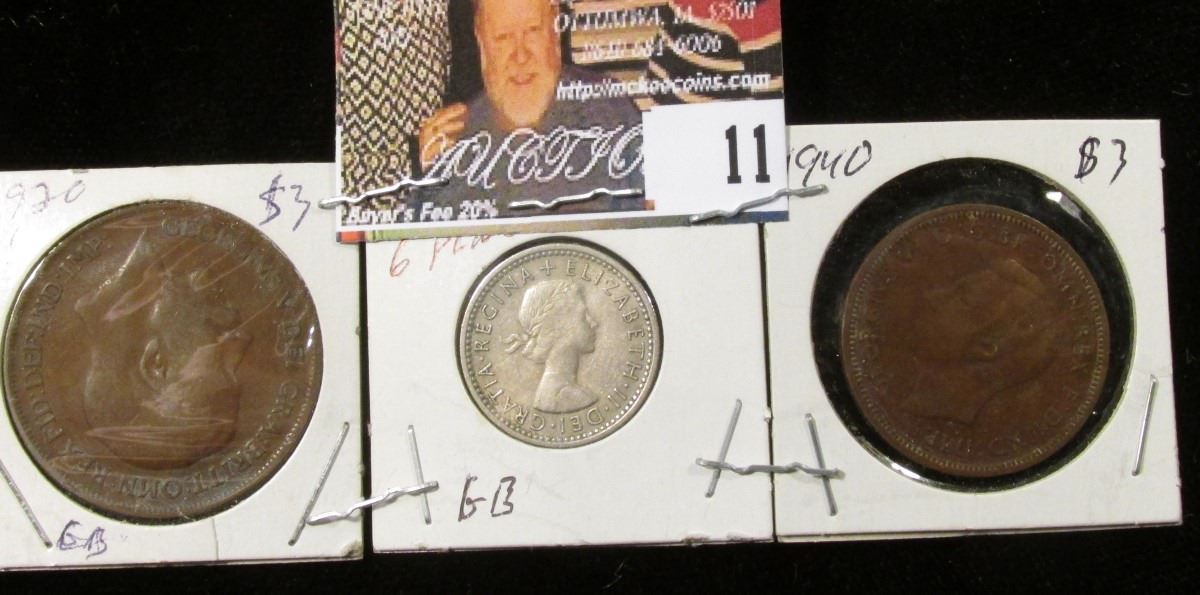 1958 Great Britain Six Pence, VF, 1920 Great Britain Large Penny, & 1940 Great Britain Half Penny, VF.