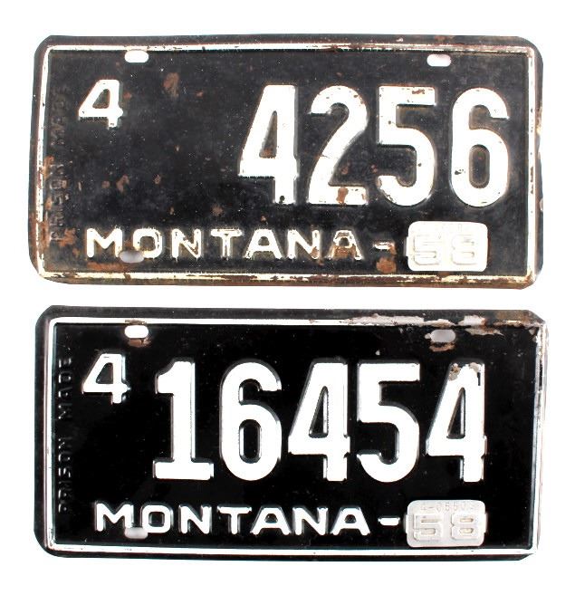This is a collection of 1958 Montana license plates. There are three matching pairs from Missoula County. Each plate is stamped on the left side "Prison Made". The license plates range in condition from fair to good. Each one measures 6" x 12".