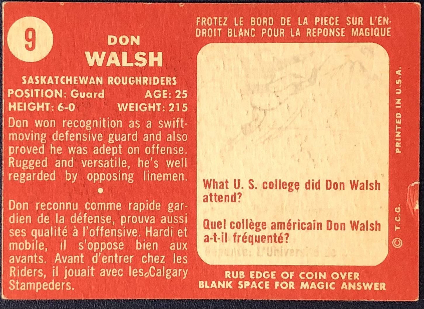 Card #9 vintage, CFL, OPC, football