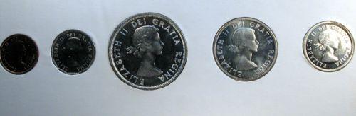 Canada 1958 Proof-Like Set in white card. The 1 cent is Red and Brown and the silver pieces are lightly toned with some cameos