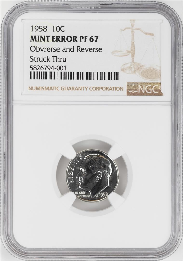 One 1958 Proof Roosevelt Dime Coin NGC PF67 Mint Error Obverse & Reverse Struck Thru. NGC Certified.