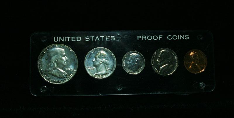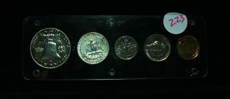 The set, has a 90% Proof Silver Franklin Half Dollar, a 90% Proof Silver Quarter, a 90% Silver Dime, 2 Other Proof Coins. Estimated Value $65