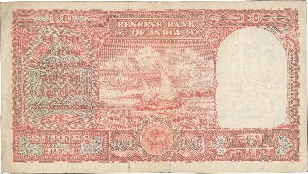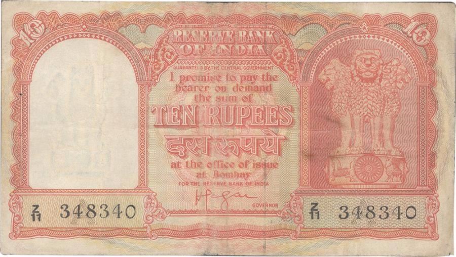 1958, 10 Rupees,Persian gulf issue,Signed by H.V.R. Iyengar,A Inset, serial No in Black, S.No. Z11 348340, (KJRR # 6.4.3.2A), about very fine, Scarce.