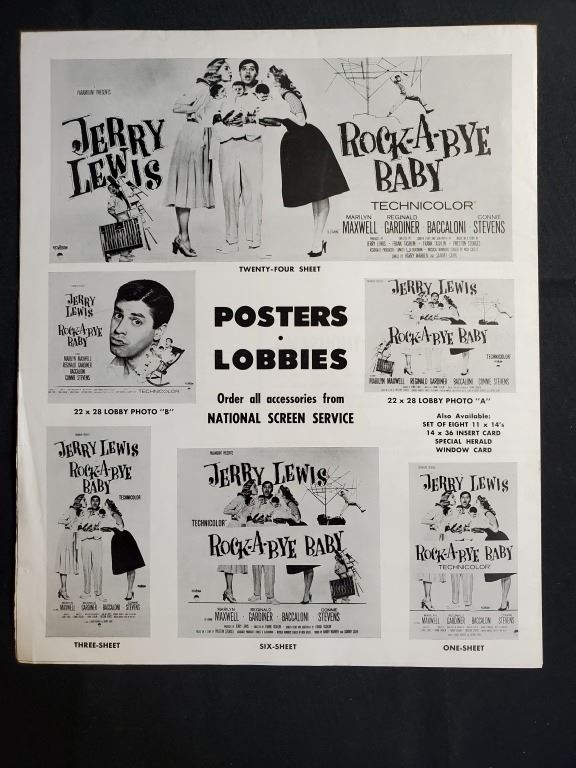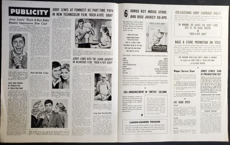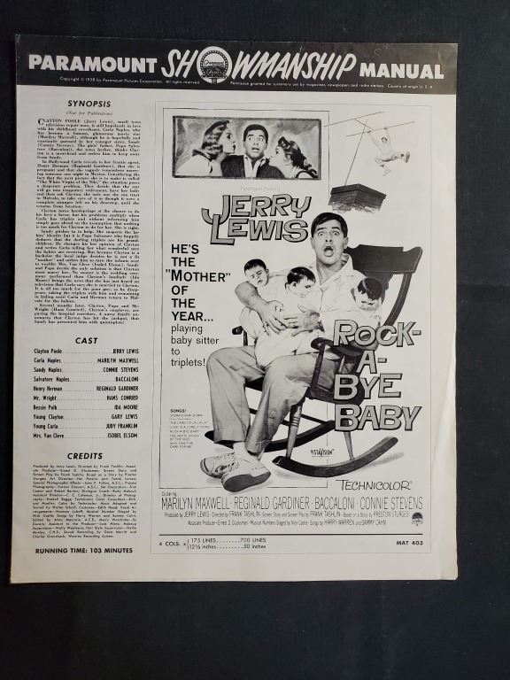 1958 Paramount Pictures Showmanship Manual starring Jerry Lewis and co starring Marilyn Maxwell, Reginald Gardiner, Baccaloni, and Connie Stevens. One big poster folded out. No cut outs.