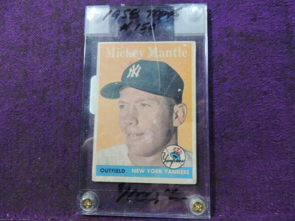 1958 TOPPS MICKEY MANTLE #150 BASEBALL CARD. BASEBALL CARD. COLLECTIBLE. VINTAGE CARD. GOOD CONDITION. SCREW DOWN CASE. TRADING CARD. AS SHOWN. SEE PHOTO FOR MORE DETAILS.