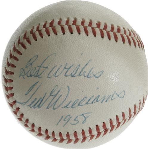 <B>1958 Ted Williams Single Signed Baseball.</B></I> If there is a finer single from the great Ted Williams' playing days, we certainly haven't seen it. For that matter, even those singles signed late in the Splinter's life could do no better than tie the presented autograph, a bona fide 10/10 blue ink inscription reading "Best Wishes, Ted Williams 1958." The spectacular OAL (Harridge) sphere has clearly been treasured by the fan to whom it was presented during Williams' final season atop the American League batting average charts, with only the fading of the ball's stamping to suggest that the ball didn't just drop out of a time machine. An absolute marvel. <I>LOA from PSA/DNA.</B></I>