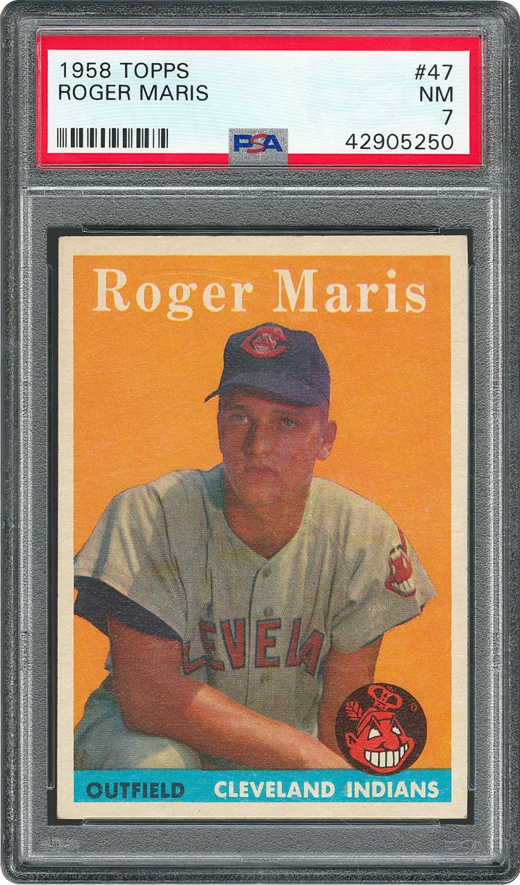Graded by PSA NM 7. Near perfectly centered example of this popular rookie card of Roger Maris, arguably the most prolific Major League baseball slugger not in the Hall of Fame. Very light touches to a couple corners, with overall better eye appeal. Appears much nicer than the assigned grade.