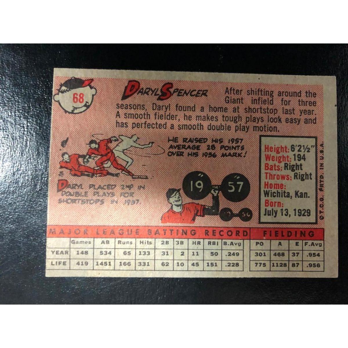 A 1958 Topps #68 Daryl Spencer Giants Baseball Card. View Photos For Further Details.