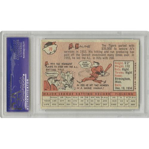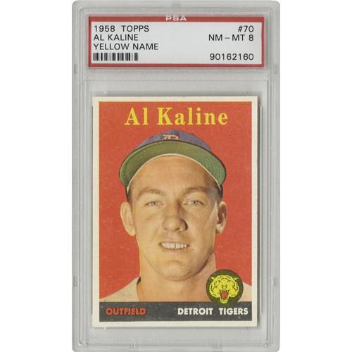 <B>1958 Topps Al Kaline Yellow Name #70 PSA NM-MT 8.</B></I> The more scarce and desirable variation of this Hall of Famer's card is the yellow name version, which is valued more than double its pale sibling. Almost invisible touches on the lower corners save this example from a Mint 9 rating, which it still might merit in a resubmission. Even the centering is fantastic here! Only two unqualified '58 Kalines have ever earned a higher rating! <BR><BR><B>Important notice:</B> Heritage usually auctions material at the rate of 200-250 lots per hour. On some occasions eBay Live bid software or the Internet may not be able to keep up with the pace of the auction. We recommend placing a realistic absentee bid now as insurance to avoid disappointment. Occasionally the auctioneer may eliminate or reject an eBay Live bid, and the auctioneer may also reopen a lot after the close of the eBay live bidding (usually because we missed an audience bid), and may reject your bid even if it shows you as the winning bidder. By bidding via eBay Live, you agree that Heritage may award the lot to another bidder at its sole discretion under the circumstances described above or any other reasonable circumstances. Since eBay bids are not shown to us until we open the lot on the floor, we treat those bids just like floor bids. In most cases the floor responds before the eBay bid is presented to us, due to Internet lag time, so for consistency we have made it a policy that floor bids are always considered first over tie eBay live bids. Also please note that all Heritage lots purchased through eBay Live carry a 22.5% Buyer's Premium. Please make sure you read the Terms and Conditions before you bid. This lot is being auctioned in conjunction with a live floor auction by Heritage Galleries & Auctioneers. All final auction and invoice information will be supplied by Heritage Galleries & Auctioneers, and all other information should be considered preliminary. Lot:19576 <BR><BR><B>Winning Notification and Billing:</B> After the FINAL session in this auction is complete, Heritage will send e-mail and snail mail invoices. This process normally takes several days. All final auction and invoice information will be supplied by Heritage Galleries & Auctioneers, and all other information should be considered preliminary. <BR><BR>This auction will be conducted on a live auction floor and over the Internet through eBay Live. If you choose to place an absentee bid, please take a moment to <font color='#0000ff'><u><a href='http://pages.ebay.com/liveauctions/help/before/laabsentee.html'>learn how eBay Live absentee bidding works</a></u></font><font color='#000000'>