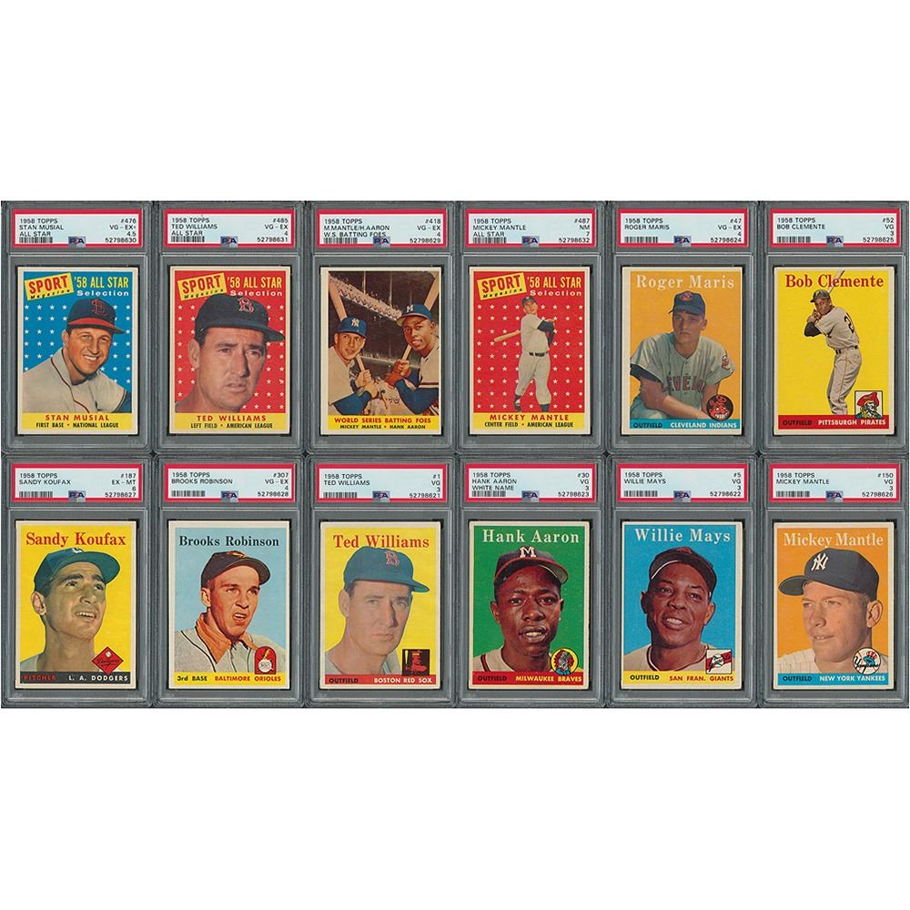 Complete set (494/494) of 1958 Topps baseball cards, grading overall at 5% EX-MT (with a few better), 40% EX, 40% VG-EX, and 15% VG or lesser. Twelve cards have been graded by PSA: