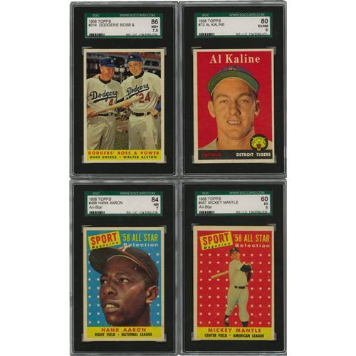 <B>1958 Topps Baseball Near Complete Set (492/494).</B></I> The 1958 Topps baseball series consists of 494 cards and included "All-Star" cards for the first time. One card (#145) was not issued after Ed Bouchee was suspended from baseball. This near set is missing only #1 Ted Williams and #87 Johnny Kucks. A total of ten cards have been graded by PSA with an aggregate SMR value of $1450. Graded cards - <B>SGC 86 NM+ 7.5</B></I> #314 Dodgers' Boss & Power; <B>SGC 84 NM 7</B></I> #187 Koufax, 488 Aaron AS; <B>SGC 80 EX-NM 6:</B></I> #5 Mays, 30 Aaron, 47 Maris, 70 Kaline; <B>SGC 70 EX+ 5.5</B></I> #52 Clemente, 150 Mantle; <B>SGC 60 EX 5:</B></I> #487 Mantle AS. Ungraded cards include #25 Drysdale (EX), 88 Snider (EX), 100 Wynn (EX), 162 Hodges (VG/EX), 285 Robinson (EX/MT), 288 Killebrew (EX), 307 Robinson (VG/EX), 310 Banks (EX), 320 Ford (EX), 321 Williams/Kluszewski (VG), 343 Cepeda (VG), 351 Braves Fence Busters (EX/MT), 370 Berra (EX), 375 Reese (EX), 418 Mantle/Aaron (VG/EX), 420 Pinson (EX), 436 Mays/Snider (EX/MT), 440 Mathews (VG/EX), 464 Flood (VG/EX), 476 Musial (EX), 485 Williams (VG/EX), 486 Mays (VG/EX). Grades 12% NM to NM/MT, 78% EX to EX/MT, 10% VG to VG/EX (some lesser).<BR><BR><b>Shipping:</b> Trading Card Set, Medium (<a target="_blank" href="http://www.heritageauctions.com/common/shipping.php">view shipping information</a>)