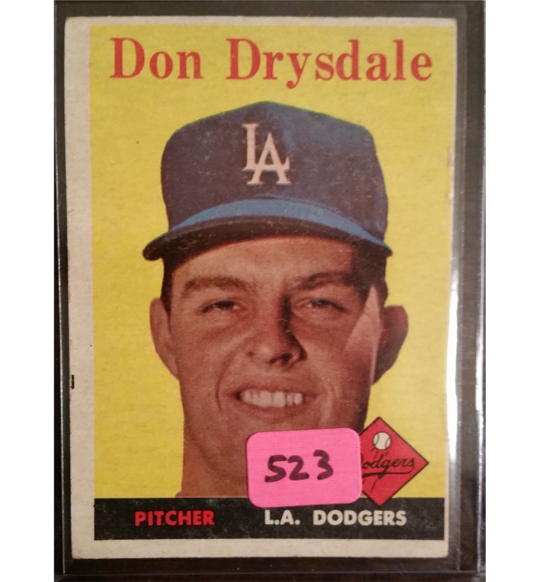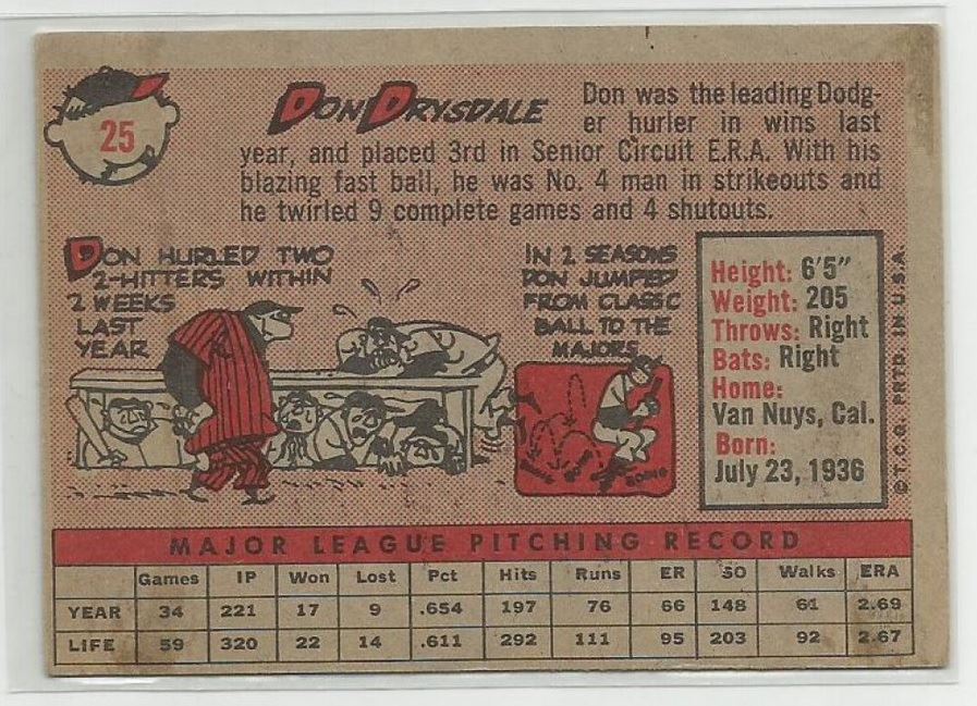 This Vintage 1958 Topps Don Drysdale Card is in Very Good Condition. This Drysdale card has a book value of $200 in slightly better condition.