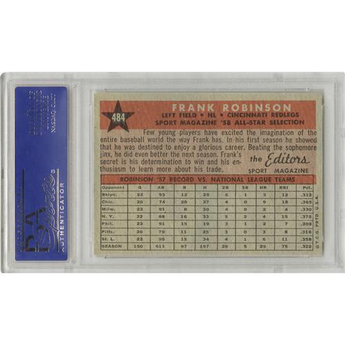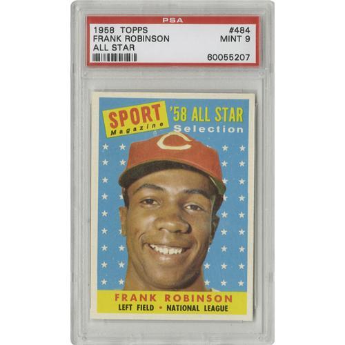 <B>1958 Topps Frank Robinson #484 PSA Mint 9.</B></I> Collectors know that these high-number cards are particularly tough, especially in the high grade boasted by our offered specimen. Perhaps it is the 55/45 left/right centering that excuses this card from encapsulation in a Gem Mint 10 holder--otherwise we're stumped. Nonetheless, only five other cards have matched this one's Mint 9 designation, with none ever surpassing it. <BR><BR><B>Important notice:</B> Heritage usually auctions material at the rate of 200-250 lots per hour. On some occasions eBay Live bid software or the Internet may not be able to keep up with the pace of the auction. We recommend placing a realistic absentee bid now as insurance to avoid disappointment. Occasionally the auctioneer may eliminate or reject an eBay Live bid, and the auctioneer may also reopen a lot after the close of the eBay live bidding (usually because we missed an audience bid), and may reject your bid even if it shows you as the winning bidder. By bidding via eBay Live, you agree that Heritage may award the lot to another bidder at its sole discretion under the circumstances described above or any other reasonable circumstances. Since eBay bids are not shown to us until we open the lot on the floor, we treat those bids just like floor bids. In most cases the floor responds before the eBay bid is presented to us, due to Internet lag time, so for consistency we have made it a policy that floor bids are always considered first over tie eBay live bids. Also please note that all Heritage lots purchased through eBay Live carry a 22.5% Buyer's Premium. Please make sure you read the Terms and Conditions before you bid. This lot is being auctioned in conjunction with a live floor auction by Heritage Galleries & Auctioneers. All final auction and invoice information will be supplied by Heritage Galleries & Auctioneers, and all other information should be considered preliminary. Lot:19580 <BR><BR><B>Winning Notification and Billing:</B> After the FINAL session in this auction is complete, Heritage will send e-mail and snail mail invoices. This process normally takes several days. All final auction and invoice information will be supplied by Heritage Galleries & Auctioneers, and all other information should be considered preliminary. <BR><BR>This auction will be conducted on a live auction floor and over the Internet through eBay Live. If you choose to place an absentee bid, please take a moment to <font color='#0000ff'><u><a href='http://pages.ebay.com/liveauctions/help/before/laabsentee.html'>learn how eBay Live absentee bidding works</a></u></font><font color='#000000'>